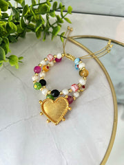 Pulsera perlas y agatas con corazón en bronce